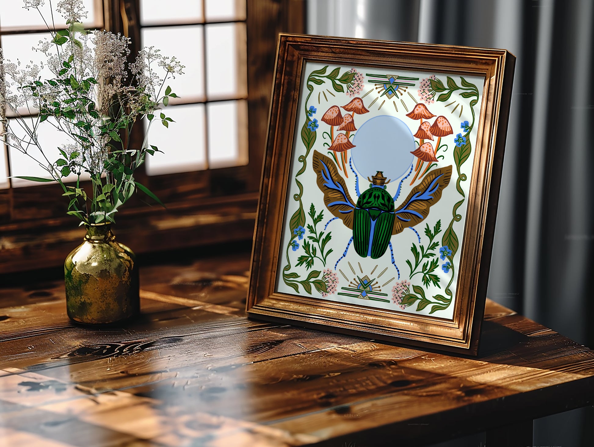 Perfect for gallery walls, studios, bedrooms, or eclectic interiors, this insect wall art print appeals to lovers of nature, entomology, and symbolic art. It also makes a unique gift for those drawn to mystical imagery, botanical illustration, or vintage-inspired design.