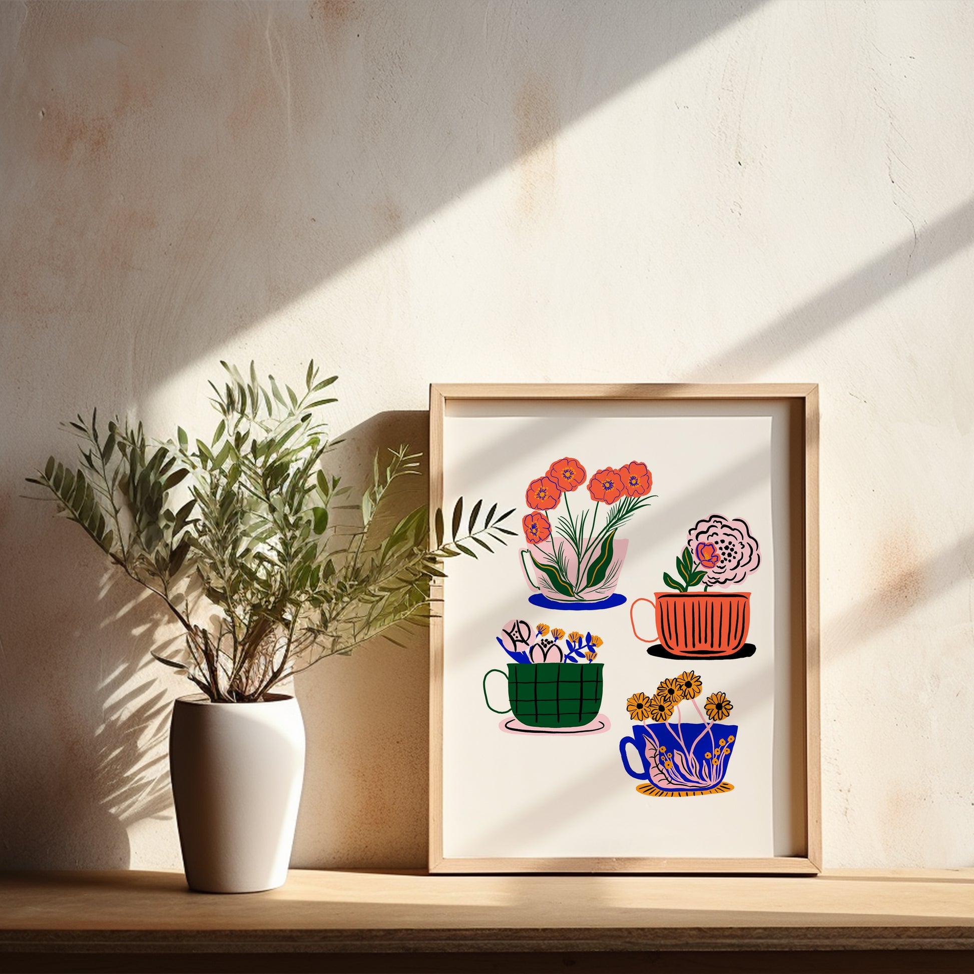 Bring charm to your space with this whimsical giclée art print of colorful teacups filled with bright flowers. Illustrated in a bold modern folk-art style, this botanical wall art makes a cheerful addition to your kitchen, dining room, or gallery wall. This vibrant floral illustration print adds warmth, color, and personality to any home.