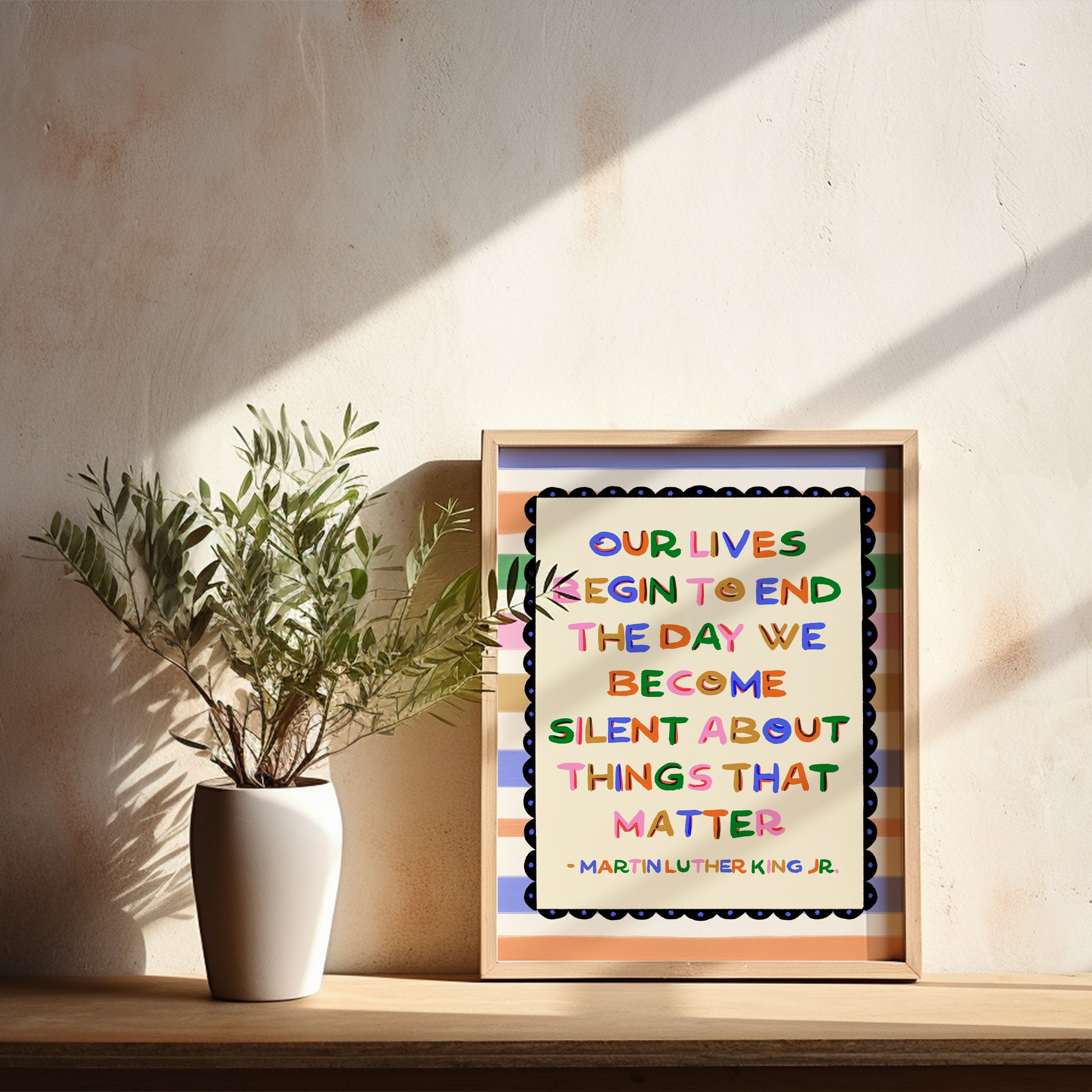 Designed to inspire conversation and reflection, this social justice wall art is perfect for classrooms, offices, studios, and homes that value equity, community, and speaking up. The bright color palette adds warmth and approachability while reinforcing the hopeful urgency of the quote.