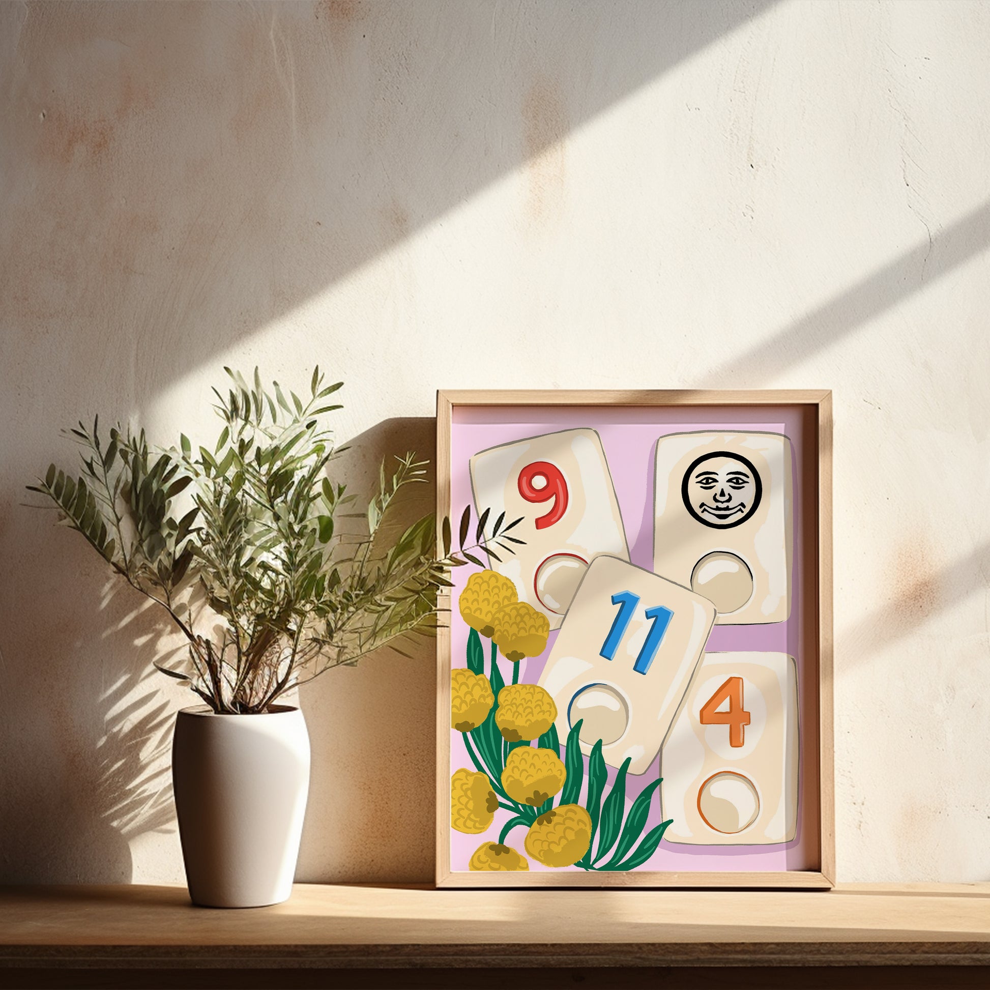 This playful art print features illustrated Rummikub-style game tiles with colorful numbers, a smiling joker tile, and bright yellow florals on a soft pastel background. A cheerful folk-art design perfect for game room décor, family spaces, and lovers of nostalgic tabletop games. Ideal for Rummikub fans, board game enthusiasts, and anyone who enjoys whimsical, colorful wall art.