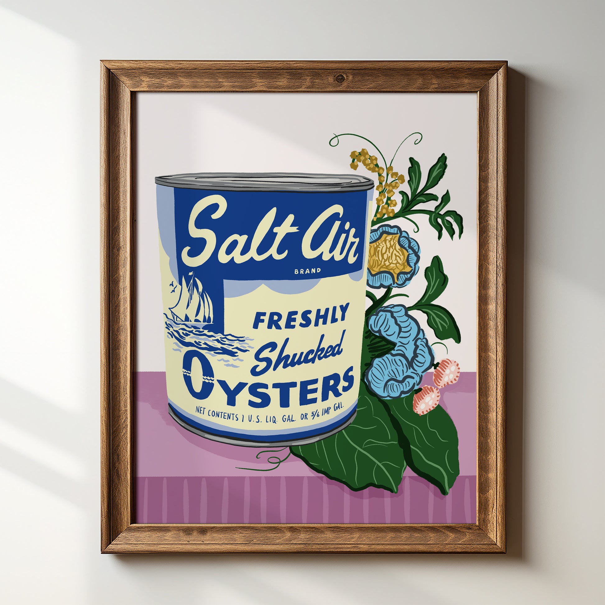 This is an 8 x 10 giclée art print featuring a vintage Salt Air Brand oysters can with a blue and cream label, sailing ship graphic, and bold retro lettering standing beside a lovely bouquet of flowers.