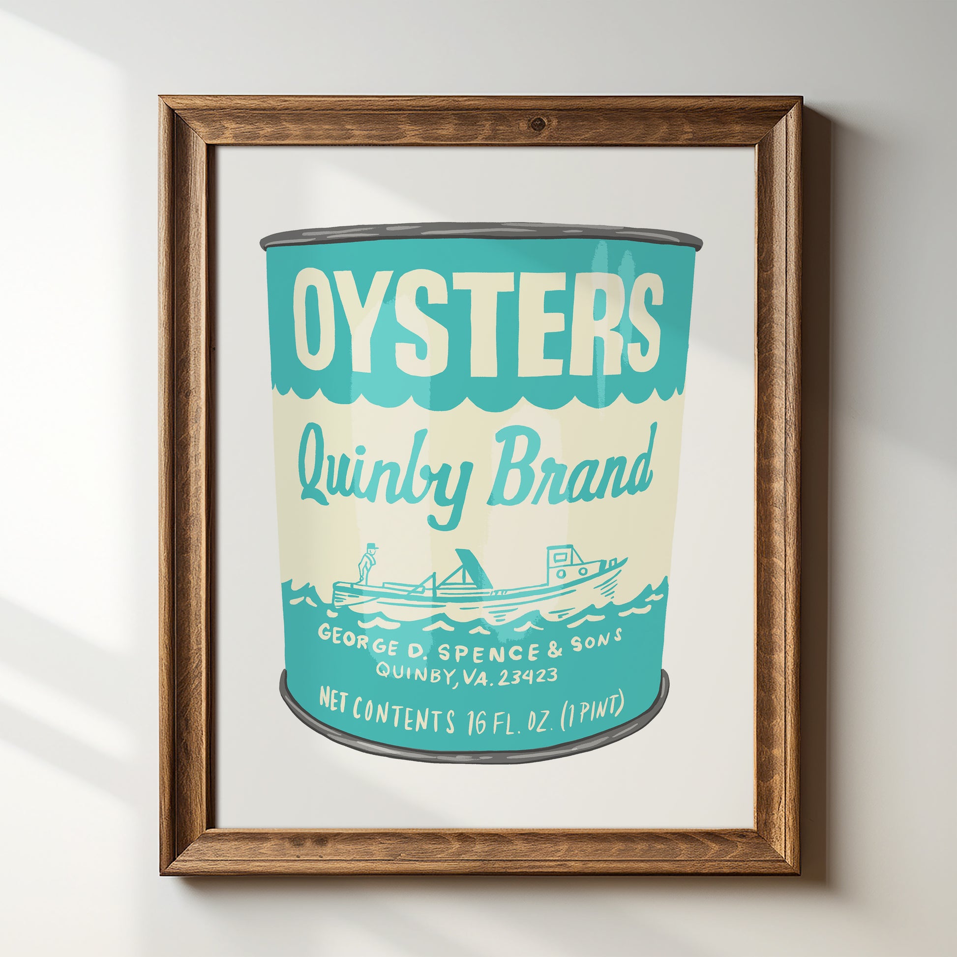 This is an 8 x 10 giclée art print featuring a classic retro seafood packaging design with bold typography, turquoise and cream colors, and a fishing boat graphic in a nostalgic maritime style.
