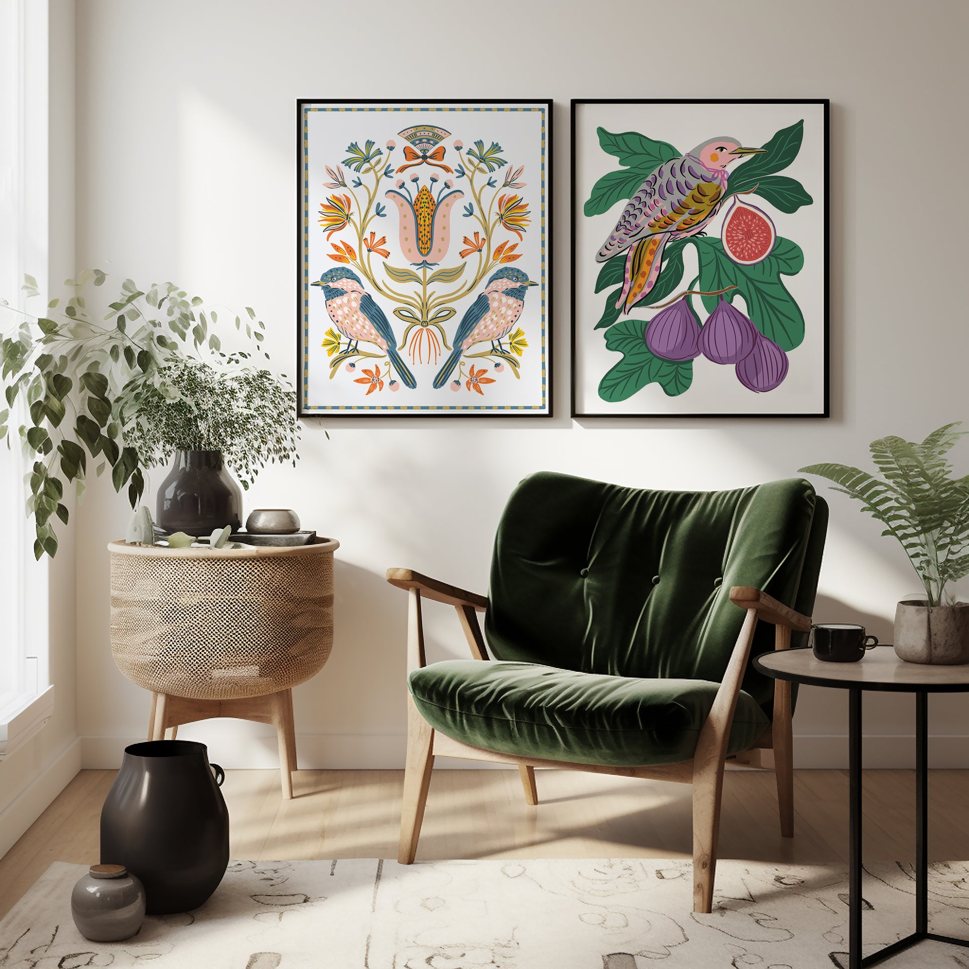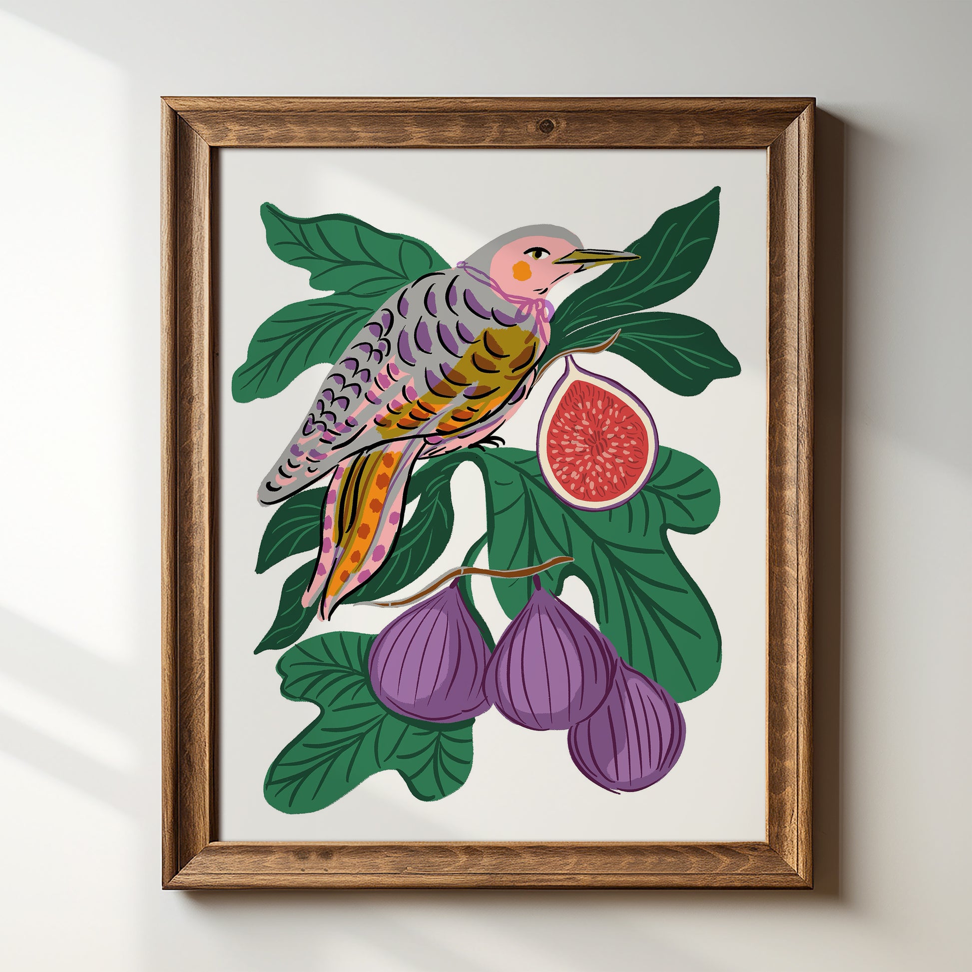 This art print features a gorgeous multicolored woodpecker perched in a fig tree. It is an original illustration by independent female artist and business owner, Tara Reed, who hopes her art brings you a bit of joy.